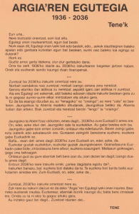 Nerea’k IDAZLEAK.EUS-EN ARGITARATUA. 2025-10-14 Norbait izandakoa zara niretzat,izango nintzen norbait nintzen zuretzat;zure hitzekairean marraztu dute zubi bat. 1936ko egun batez,amets bat bidali zenuengerora etorriko zen aldira,2036ra —Nork esan dit, egutegi onen iyeki bat edo bestek,edo… askok, idaztitegiren bateko apalan,edo ganbara kutxetanegun bat bestean,eunki oso bateko loa egingo ez dutenik? Inbokatu zenuen irakurle bat,eta sinistu zenueneuskara…
